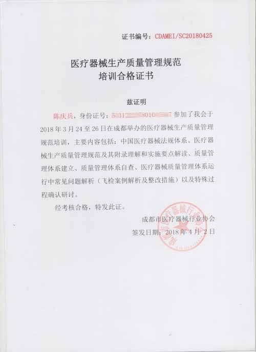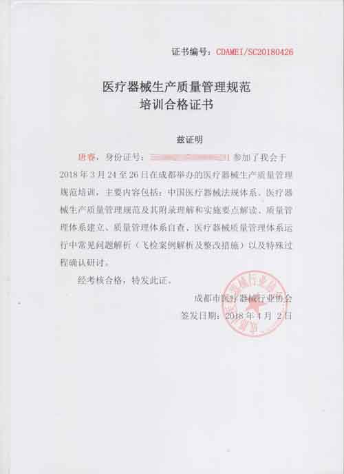 根据中国食品药品监督管理总局(CFDA)2014年发布了《医疗器械生产质量管理规范》,及后又陆续发布了系列配套现场检查指导原则文件,简称“医疗器械GMP”文件,是产品注册体系、生产许可、监督检查和飞行检查的核心要求文件。公司为规范日常管理工作,提高管理人员的对相关规范文件的精准理解和运用,特安排了管代、生产部、综合部负责人参加了成都市医疗器械行业协会与北京国医械华光认证有限公司(简称CMD,原中国医疗器械质量认证中心)联合开展医疗器械飞检案例与GMP实际操作培训】工作,并取得了培训合格证书。