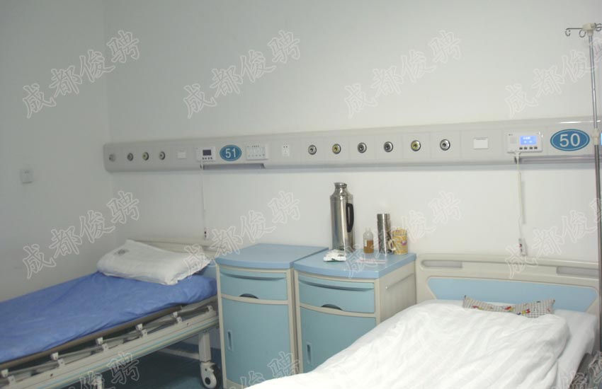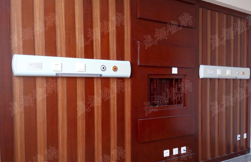 病房设备带:主要由连接底板、圆弧侧板、侧板支架和安装面板组成,材质为防锈处理铝材,其中侧板和安装面板的表面静电喷塑,颜色可根据病房装修风格协调一致。 各种气体终端、医用传呼、电源插座、床头灯全部安装在设备带上,病房整洁、美观、方便管理。