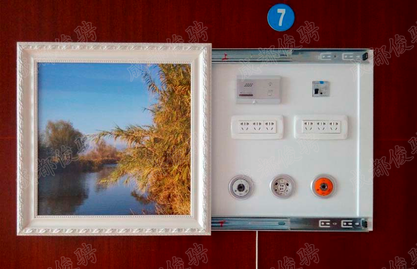 画框式终端盒:我公司可为医院提供VIP病房专用画框式终端盒,将终端、电源等设备通过终端盒嵌入墙内,同时配置与病房环境一致的可左右滑动的画框,提高病房档次。